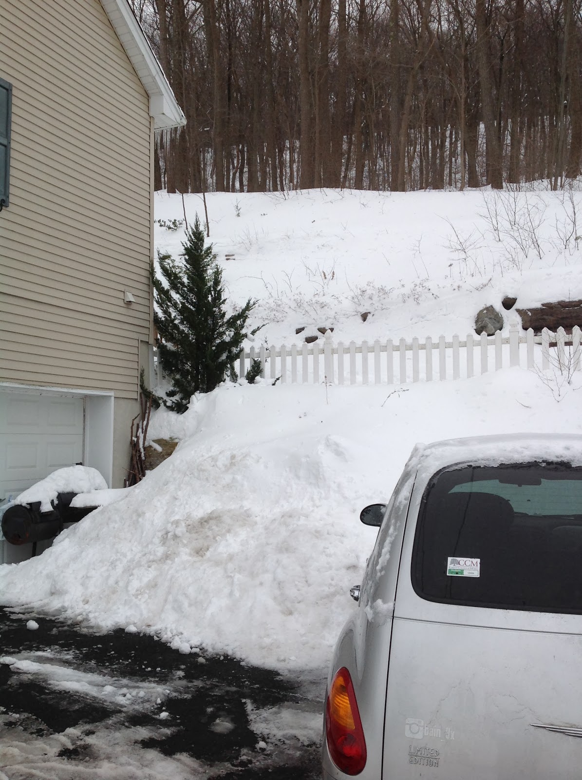 This view is from my driveway looking up into the back... my daughter fell into a drift up there behind the fence yesterday and sank up to her waist, she's just under 5 foot tall... there is a 6 foot rock retaining wall behind that snow pile... somewhere... the picket fence is only 1/3 showing at this point...